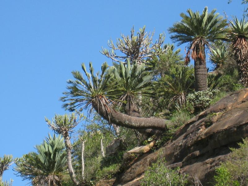 Moonstone - is a farm situated 40km west of Stutterheim on the Quanti river, which is a tributary of the Great Kei River. The vegetation is thicket in the valley bottoms rising to sub-escarpment grassland on the hills. The area is unique because it is the only place in South Africa where three species of cycad occur side by side - Encephalartos guilielmi, E. princeps and E. caffer. There is a self-catering cottage, and the Moonstone Magic Cycad Trail is a an exciting, though tough activity that guests may undertake.